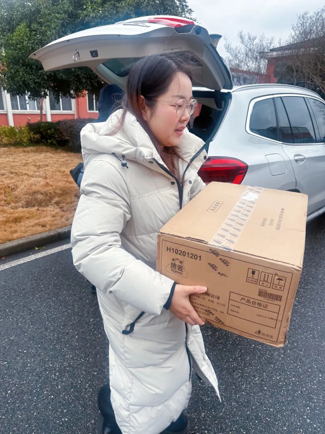 教师团队冒着寒风,将精心准备的“暖冬礼包”搬下车——涵盖可溶性纸品、益智玩具、背包,每份礼物都带着宝马职业培训学校教师们的关心和祝福。